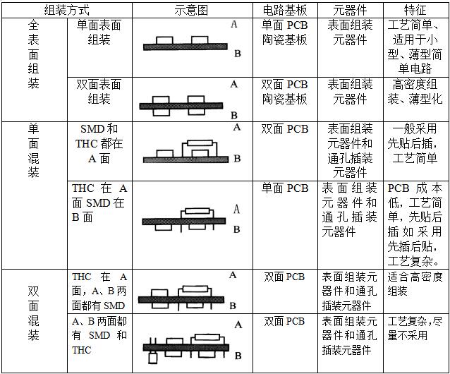 二、按组装方式,可分为全表组装、单面混装、双面混装三种方式(见表2-1)。