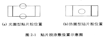 (1) 采用光固型贴片胶,元器件下面的贴片胶致少有一半的量处于被照射状态;采用热固型贴片胶,贴片胶可完全被元器件覆盖,见图2-1;