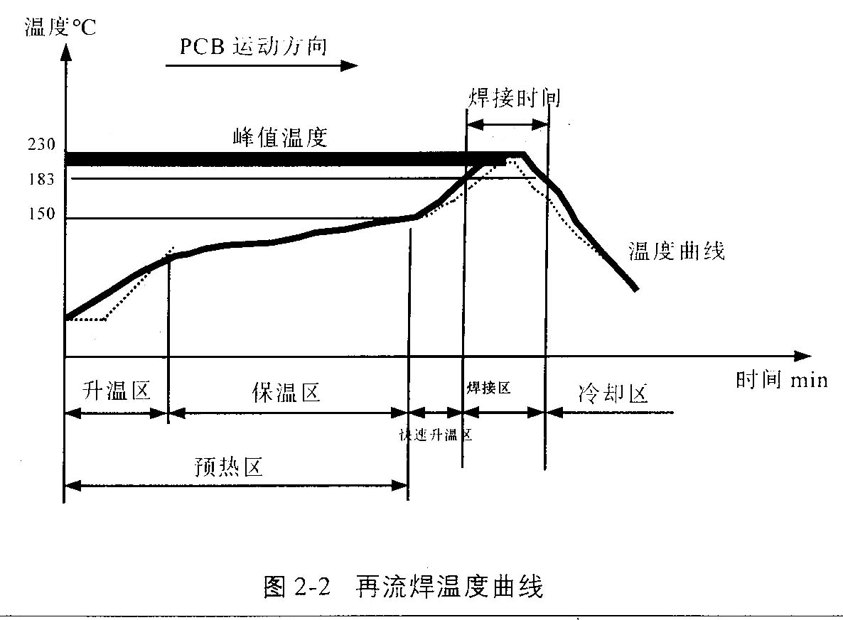 从温度曲线(见图2-2)分析再流焊的原理:当PCB进入升温区(干燥区)时,焊膏中的溶剂、气体蒸发掉,同时,焊膏中的助焊剂润湿焊盘、元器件端头和引脚,焊膏软化、塌落、覆盖了焊盘、元器件端头和引脚与氧气隔离→PCB进入保温区时,PCB和元器件得到充分的预热,以防PCB突然进入焊接高温区而损坏PCB和元器件→当PCB进入焊接区时,温度迅速上升使焊膏达到熔化状态,液态焊锡对PCB的焊盘、元器件端头和引脚润湿、扩散、漫流或回流混合形成焊锡接点→PCB进入冷却区,使焊点凝固。此时完成了再流焊。