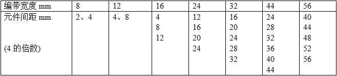 纸带和塑料带的孔距为4mm,(1.0*0.5mm以下的小元件为2mm),元件间距 4m的倍数,根据元器件的长度而定。编带的尺寸标准见表4-4。