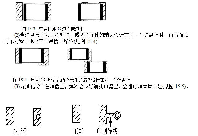 (2)焊盘间足L—确保元件端头或引脚与焊盘哈当的搭接尺寸。焊盘间距过大或过小都会引起焊接缺陷;(见图15—1)。