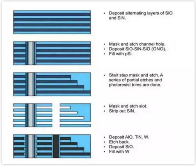 三星则开发了 Terabit Cell Array Transistor (TCAT)工艺。TCAT 是一种后栅极方法( gate-last approach),其沉积的是交替的氧化物和氮化物层。然后形成一个穿过这些层的通道并填充 ONO 和 pSi。然后与 BiCS 工艺类似形成阶梯。最后,蚀刻一个穿过这些层的槽并去除其中的氮化物,然后沉积氧化铝(AlO)、氮化钛(TiN)和钨(W)又对其进行回蚀(etch back),最后用坞填充这个槽。如下图所示: