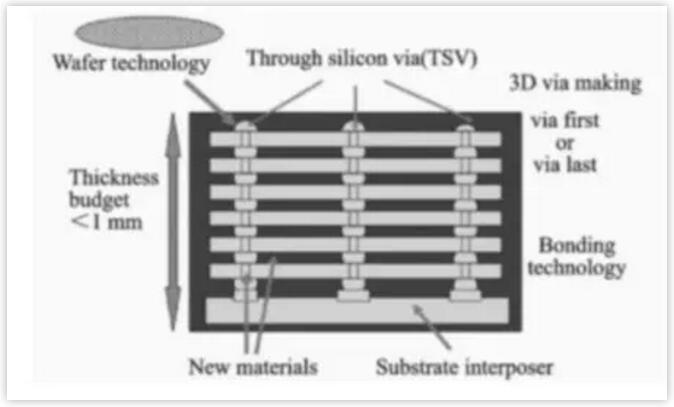 与传统的二维芯片把所有的模块放在平面层相比,三维芯片允许多层堆叠,而过TSV用来提供多个晶片垂直方向的通信。其中,TSV是3D芯片堆叠技术的关键。