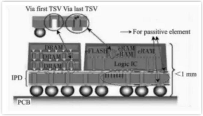 在这种3D集成技术中,至少有一颗裸芯片与另一颗裸芯片叠放在一起,下方的那颗裸芯片是采用TSV技术,通过TSV让上方的裸芯片与下方裸芯片、SiP基板通讯。如下图所示: