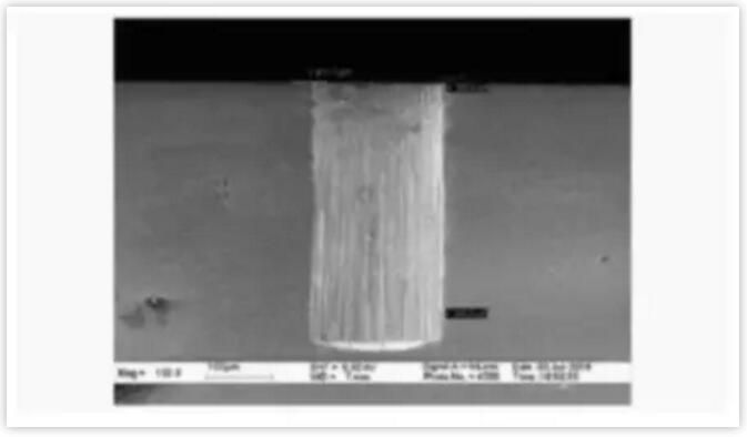圆片上通孔制造是TSV技术的核心,目前,钻蚀TSV技术主要有两种,一种是干法刻蚀或称博世刻蚀,另一种是激光刻蚀。博世工艺为MEMS工艺而开发,快速地在去除硅的SF6等离子刻蚀和实现侧壁钝化的C4F8等离子沉积步骤之间循环切换。下图为南京电子器件所(NEDI)利用博世工艺制作的TSV硅通孔。