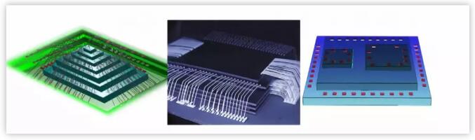 3D IC的初期型态,目前仍广泛应用于SiP领域,是将功能相同的裸芯片从下至上堆在一起,形成3D堆叠,再由两侧的键合线连接,最后以系统级封装(System-in-Package,SiP)的外观呈现。堆叠的方式可为金字塔形、悬臂形、并排堆叠等多种方式,参看下图。
